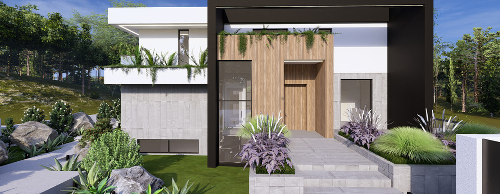A entrada principal, marcada por um enquadramento estrutural escuro e elementos verticais em madeira, cria um gesto arquitetónico distintivo. A paisagem foi desenhada para envolver a casa de forma orgânica, integrando vegetação nativa, gabions naturais e percursos que acompanham suavemente o terreno.